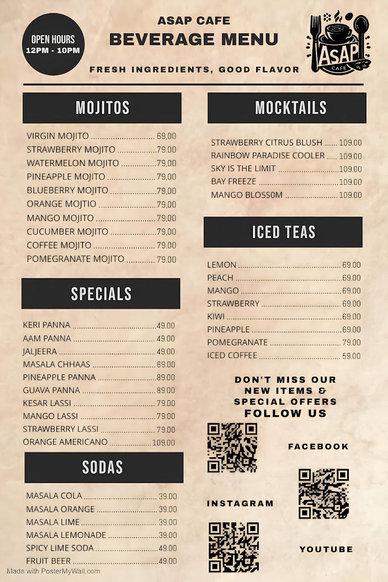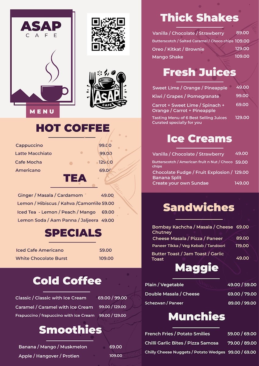 Welcome to ASAP CAFE, a delightful gem nestled in the heart of Sitapur, Uttar Pradesh. This welcoming cafe boasts a modern yet cozy ambiance, perfect for a relaxing afternoon or an energetic meetup with friends. The menu is thoughtfully curated, featuring a variety of refreshing iced teas such as Lemon and Peach, each priced at just ₹69, alongside an inviting selection of thick shakes like the indulgent Oreo shake at ₹129.